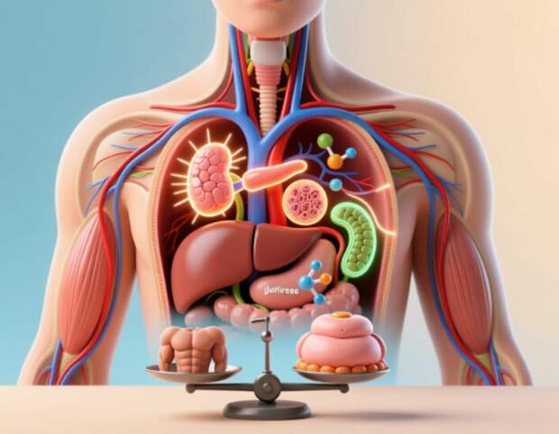 Тестостерон – основной анаболический гормон, способствующий наращиванию мышечной массы и поддержанию низкого процента жира. У мужчин (и в меньшей степени у женщин) снижение уровня тестостерона с возрастом или из-за стресса часто коррелирует с потерей мышечной массы и увеличением жировой. Мышцы являются «метаболической печью», сжигающей калории, поэтому их потеря неизбежно ведет к замедлению метаболизма и набору веса.